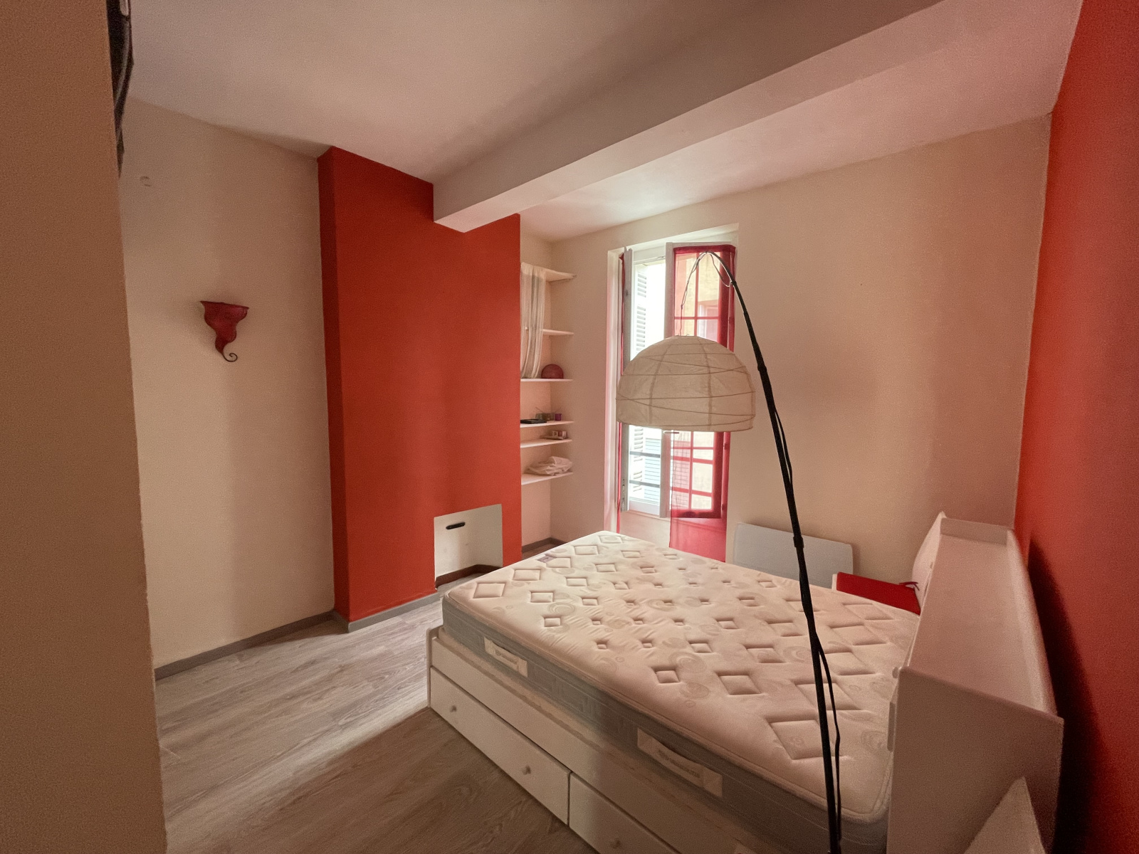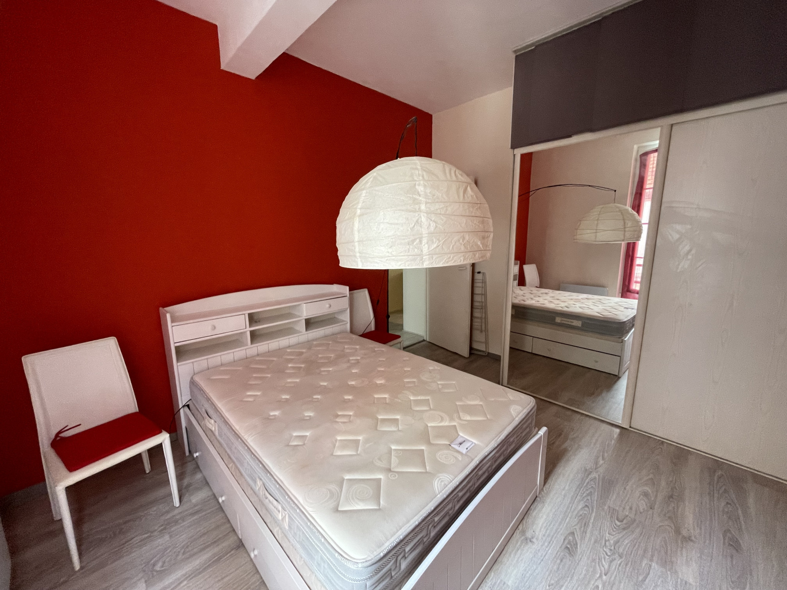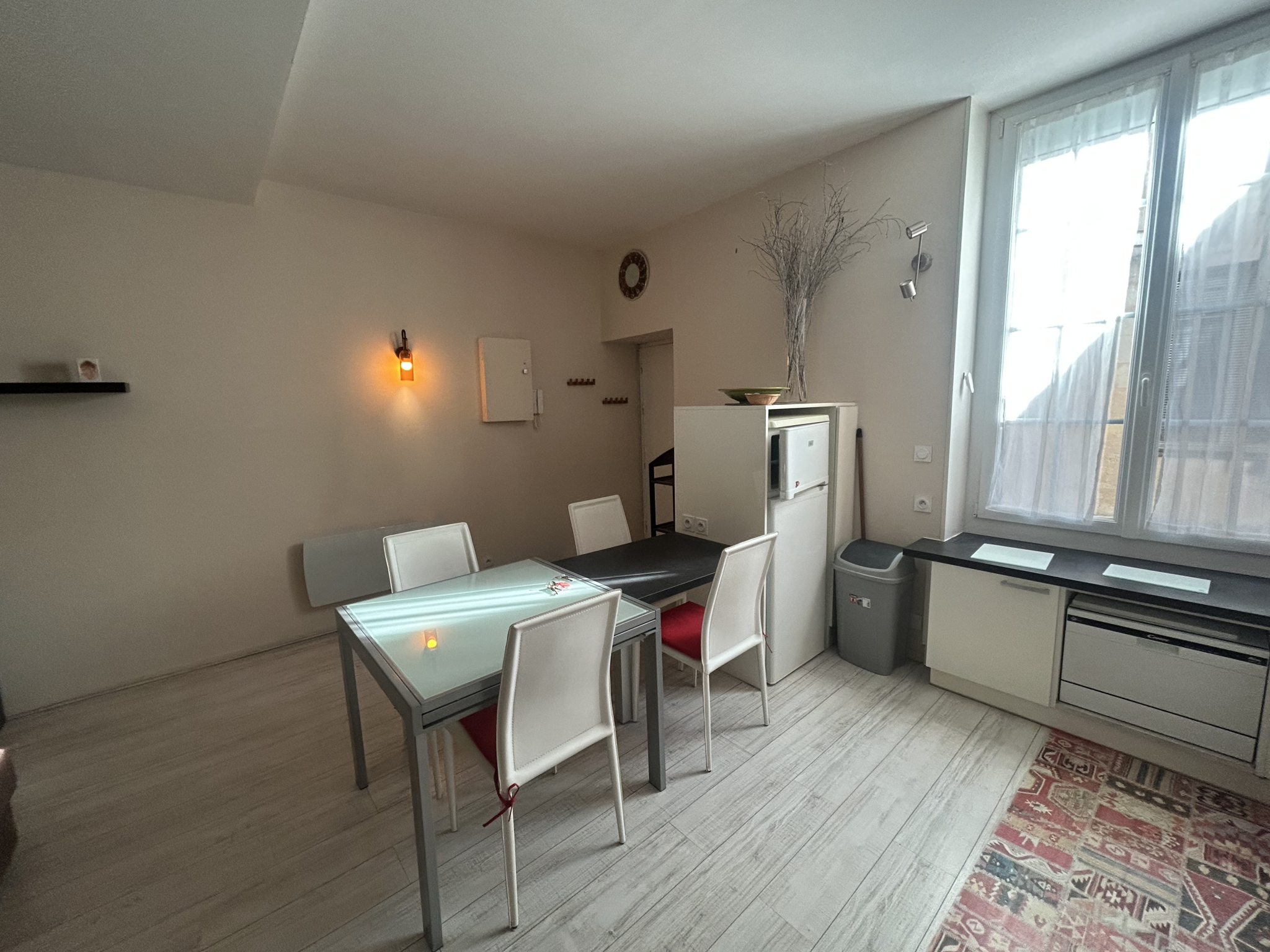 Entrée sur pièce de vie : espace cuisine équipée: four- four micro ondes- plaque- hotte- lave vaisselle- nbrx rangements .. une salle de douche avec wc - 1 chambre avec placard.
