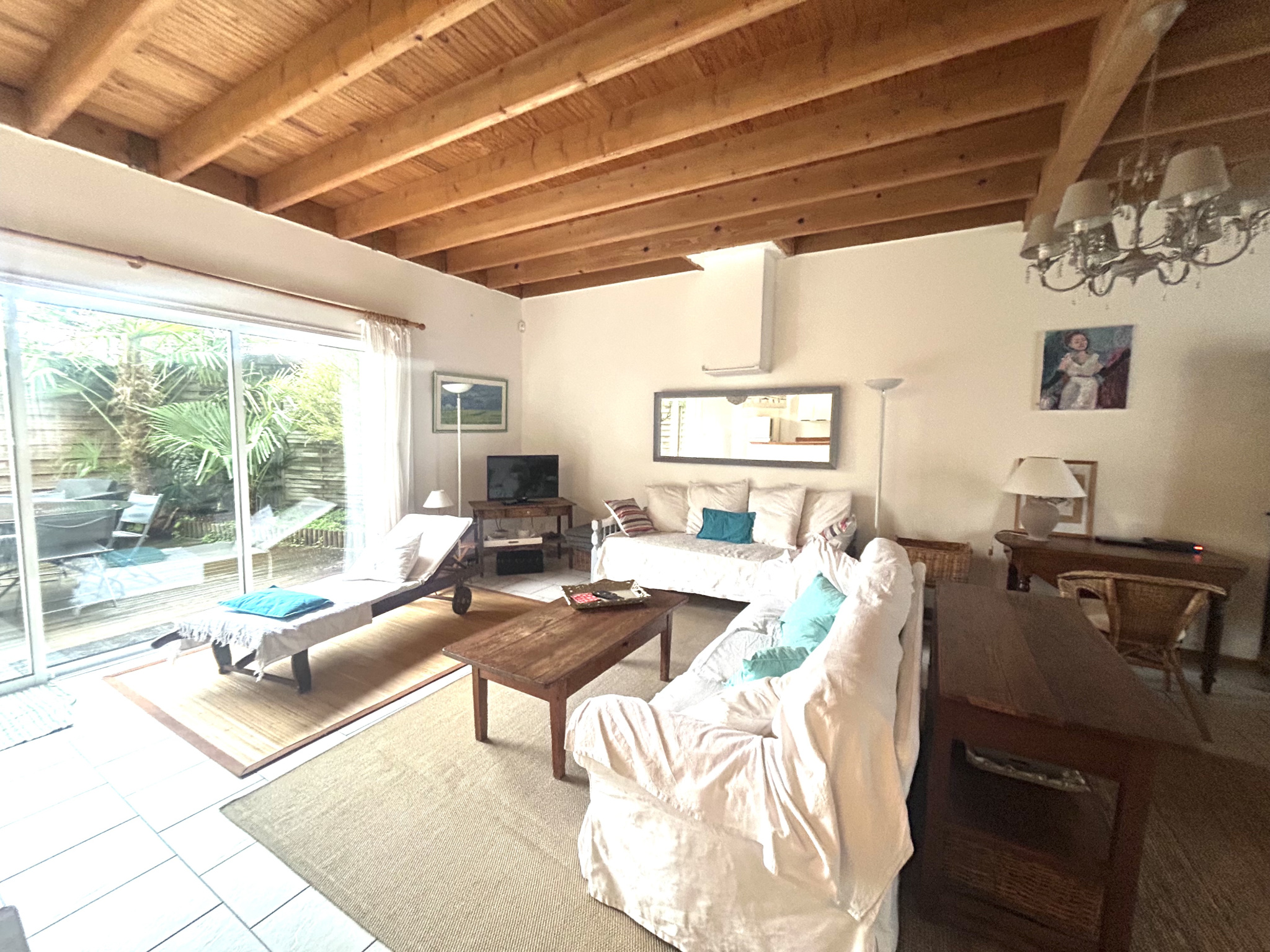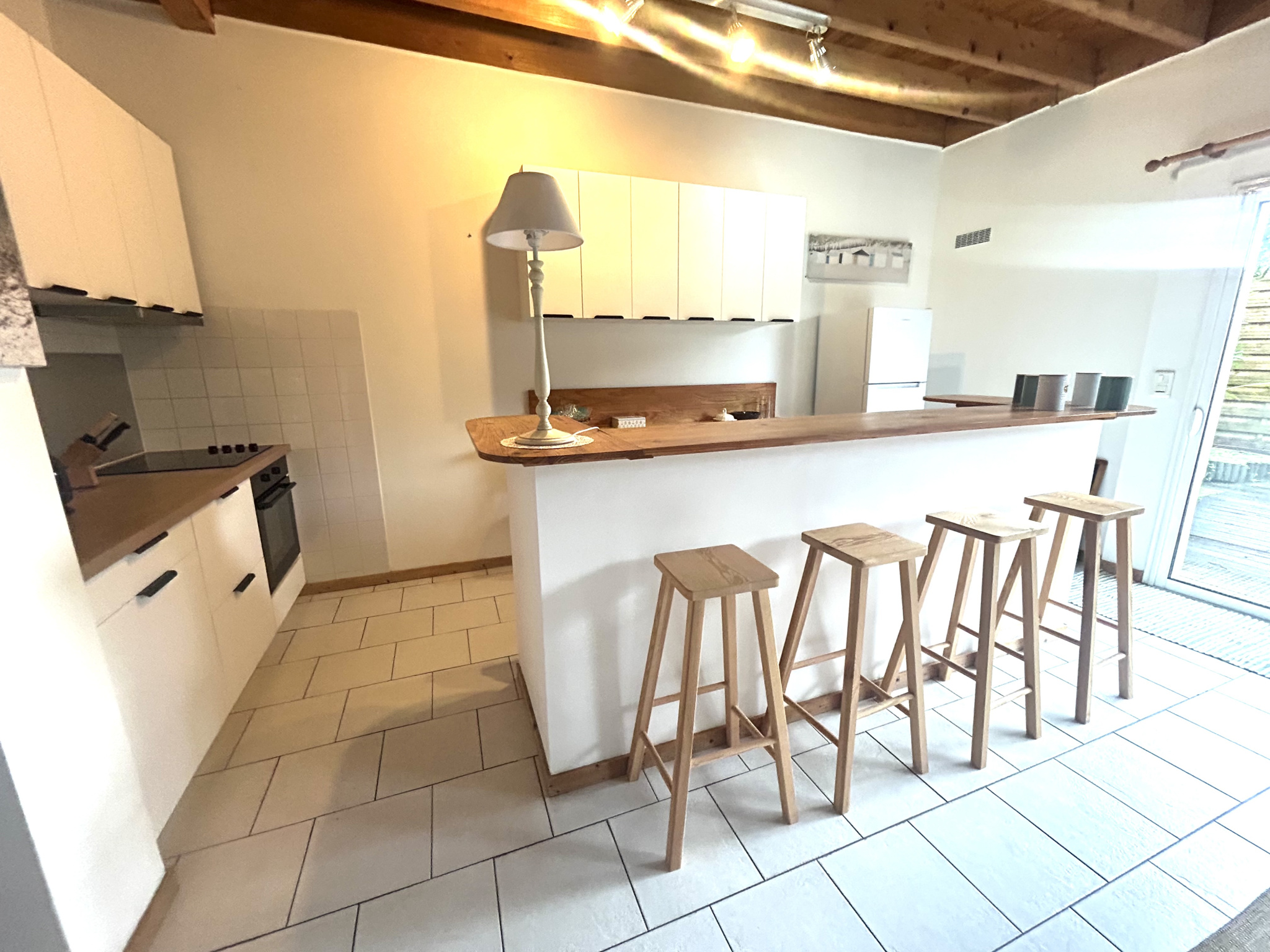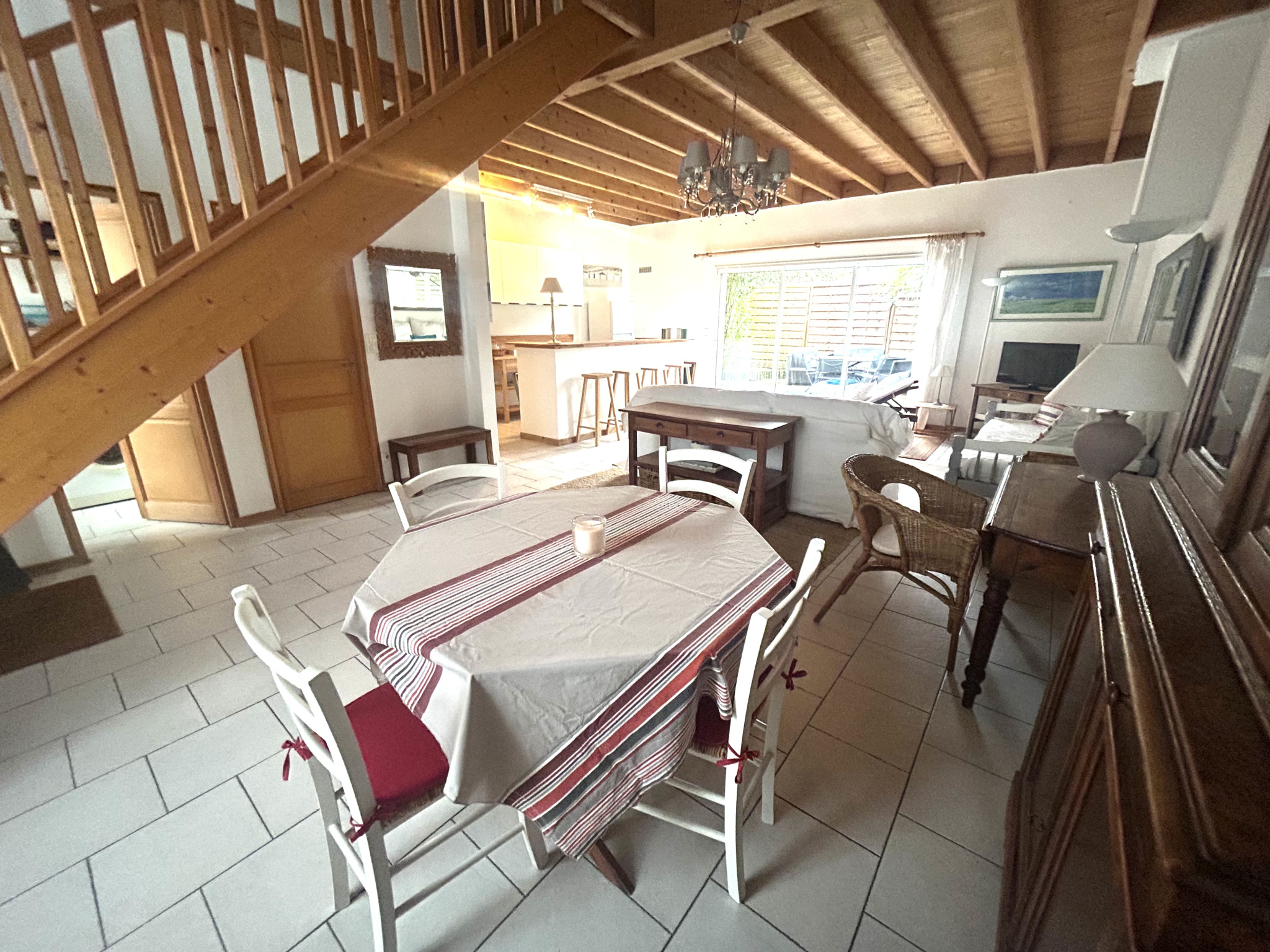 Au RDC : Elle est composée d'un grand salon / salle à manger avec une belle hauteur sous plafond et poutres apparentes, ouvert sur le coin cuisine, un bureau , un wc .